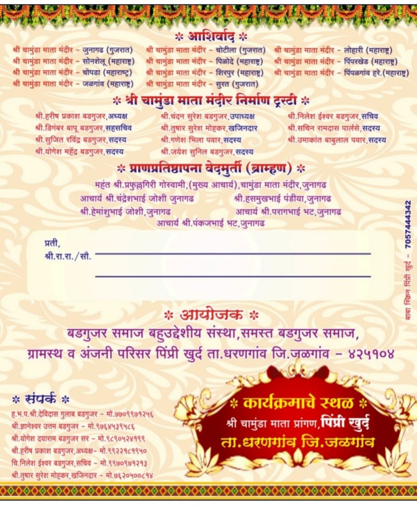 कुलदैवत श्री चामुंडा मातेचे भव्य मंदीर उभारण्या साठी आपले सर्व समाज बंधू व भगिनी चे सहकार्य अपेक्षित आहे