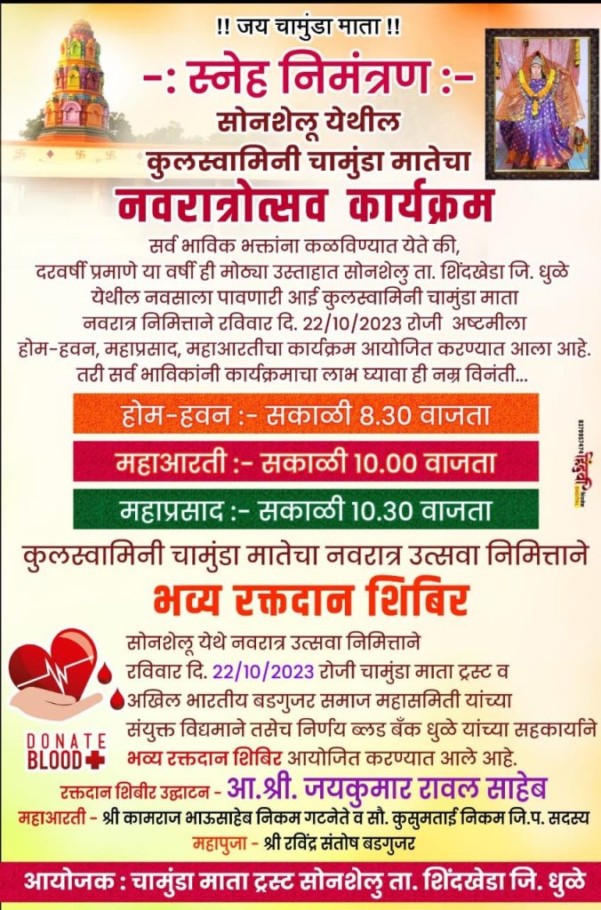 सोनशेलू येथील कुलस्वामिनी चामुंडा माता नवरात्रोत्सवा निमित्त भव्यदिव्य रक्तदान शिबिराचे आयोजन October 19, 2023 Lokesh समाजिक कार्यक्रम (Functions) 0 Share this:WhatsApp
