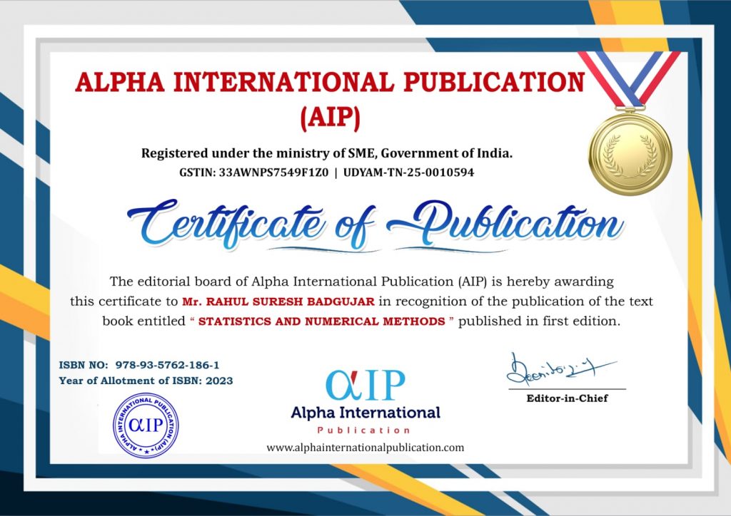 चि. राहुल सुरेश बडगुजर सर(पवार) यांचे द्वितीय पुस्तक STATISTICS AND NUMERICAL METHODS पब्लिश – श्री. निलेश बडगुजर, भुसावळ