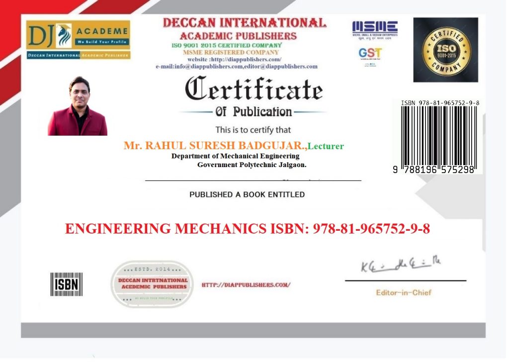पिंप्री खुर्द ह.मु. धरणगांव येथील सेवानिवृत्त श्री. सुरेश रघुनाथ बडगुजर (पवार) नगर परिषद पाणीपुरवठा विभाग व सौ. देवकाबाई सुरेश बडगुजर यांचे द्वितीय चि. राहुल सुरेश बडगुजर सर (पवार) यांचे द्वितीय पुस्तक STATISTICS AND NUMERICAL METHODS पब्लिश व प्रथम पुस्तक , Engineering Mechanics हेही पब्लिश झाले आहे. अजुन एक गोष्ट सांगावशी वाटते ती म्हणजे बडगुजर समाजात एक मानाचा तुरा रोवण्यात आला आहे. भारताच्या पेटंट कार्यालया तर्फे “INTELLIGENCE ROBOTIC CAR” प्रकाशित आणि मंजुर करण्यात आले चि. राहुल सुरेश बडगुजर सर यांचे धरणगांव बडगुजर समाज पंच मंडळ माजी अध्यक्ष व पाठबंधारे विभाग सेवानिवृत्त श्री. मनोहर गंगाराम बडगुजर, श्री. रोहित मनोहर बडगुजर प्राउड ग्रुप सदस्य व बडगुजर. इन चे प्रतिनिधी व बडगुजर प्राउड ग्रुप सदस्य श्री. विनोद श्रीराम मोहकर यांच्या कडून शाल, श्रीफळ, व गुलाबपुष्प देऊन सत्कार व अभिनंदन करण्यात आले.