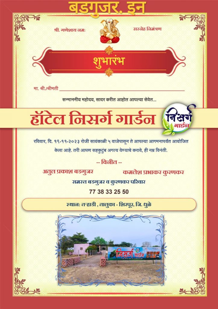आपणास मानाची विनंती आहे की आपण आपल्या जीवनातील अमूल्य वेळ काढून हॉटेल च्या उदघाटन प्रसंगी अगत्याने यावे.