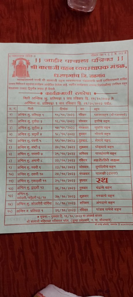 श्री बालाजी वाहन व्यवस्थापक मंडळ धरणगाव, च्या वतीने धरणगाव परिसरातील अंदाजे १२५ वर्षाची परंपरेने, प्रथेनुसार अखंडपणे आनंदी वातावरणात वहन उत्सव हा उत्स्फूर्तपणे साजरा होतो. धरणगांव भागातील एकमेव श्री बालाजी वाहन व रथोत्सव शुभारंभ हा दिनांक १५/१०/२०२३ वार रविवार पासून सुरूवात झाली व सांगता ही २०/१०/२०२३ वार रविवार रोजी झाली. महोत्सव पूर्वीच्या काळात अनेक संकट आली पण श्री च्या कृपेने सदर महोत्सव हा अखंड पणे साजरा होत आहे. या प्रति वर्षीप्रमाणे हा महोत्सव साजरा होत आहे तरी शोभा यात्रेस आपण सहकुटुंब, इष्टमित्रसह उपस्थित राहून शोभा वाढवली यावेळेस धरणगांव पंच मंडळ चे सर्व पदाधिकारी, धरणगांव बडगुजर बंधु व भगिनी उपस्थित होते.