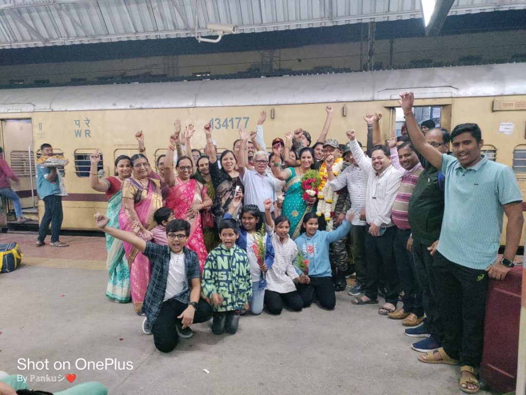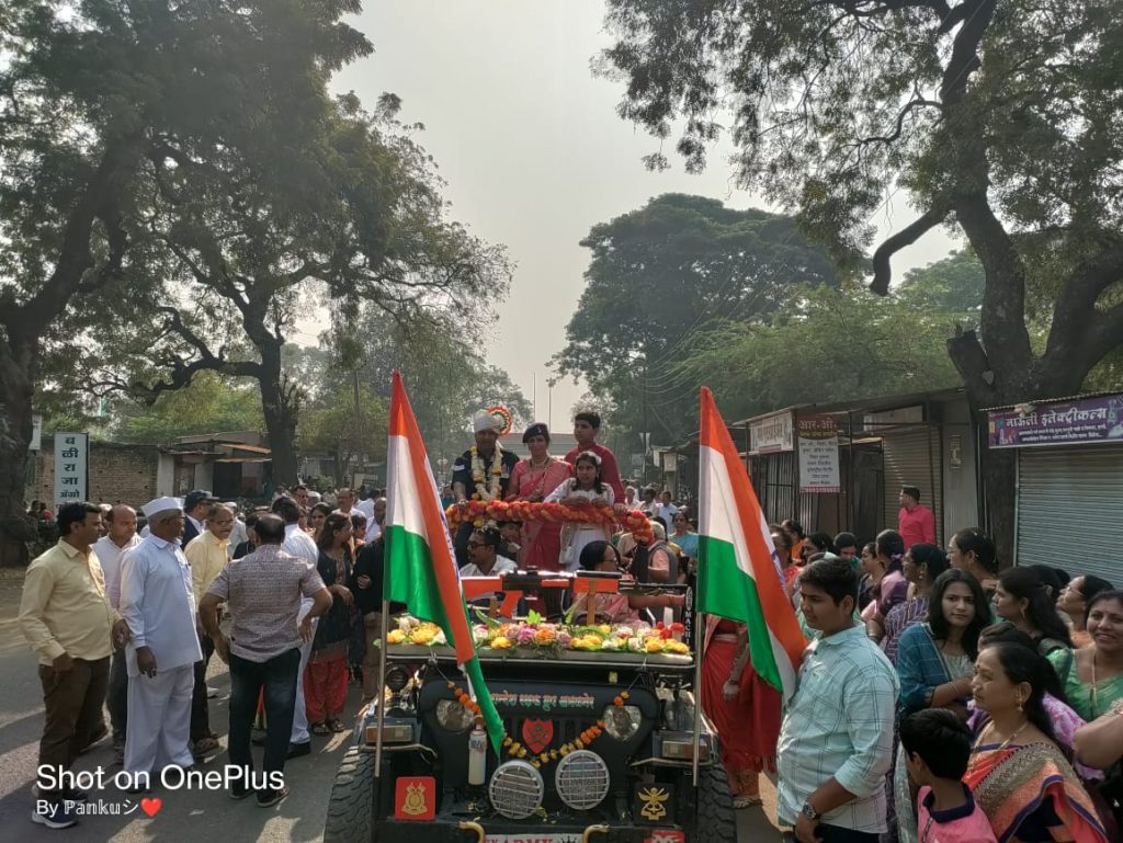 रेल्वे स्टेशन वरती उतरल्यानंतर त्यांचे नातेवाईक, मित्रपरिवार, यांनी स्वागत केले. तसेच रात्री पिंपळकोठा गावांमध्ये चामुंडा माता मंदिर संस्थान चे विश्वस्त मंडळी आणि बडगुजर समाजातील मंडळींनी औक्षण करून त्यांचे स्वागत केले.