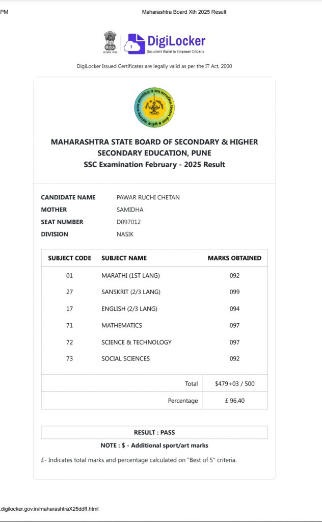 धुळे येथील श्री. चेतन देवीदास पवार व सौ. समिधा चेतन पवार यांची कन्या कु. रुचि चेतन पवार शैक्षणिक १० स्टेट बोर्ड परीक्षेत ९६℅ गुण मिळुन उत्तीर्ण.