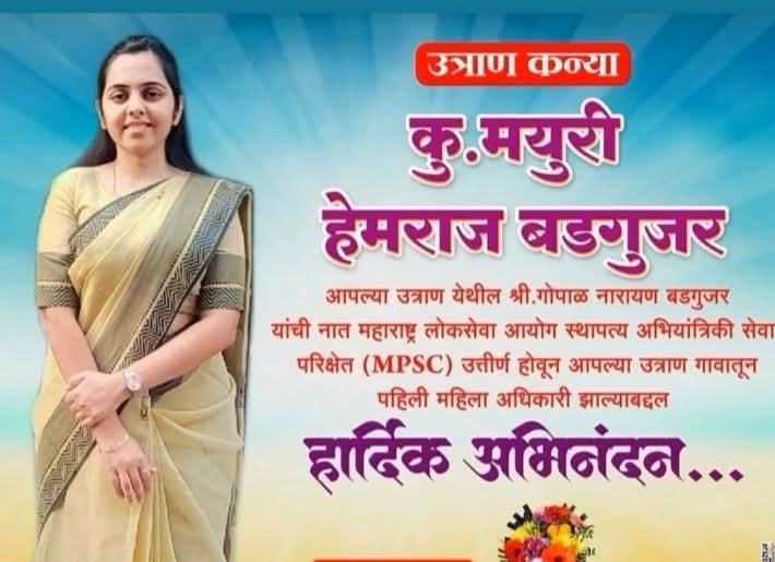 मृद व जलसंधारण विभाग जळगाव येथे जलसंधारण अधिकारी म्हणून कार्यरत असलेली कु. मयुरी हेमराज बडगुजर ही महाराष्ट्र लोकसेवा आयोग स्थापत्य अभियंतात्रिकी सेवा परीक्षेत एम पी एस सी उत्तीर्ण होऊन उत्राण गावातून पहिली महिला अधिकारी झाल्याबद्दल हार्दिक अभिनंदन