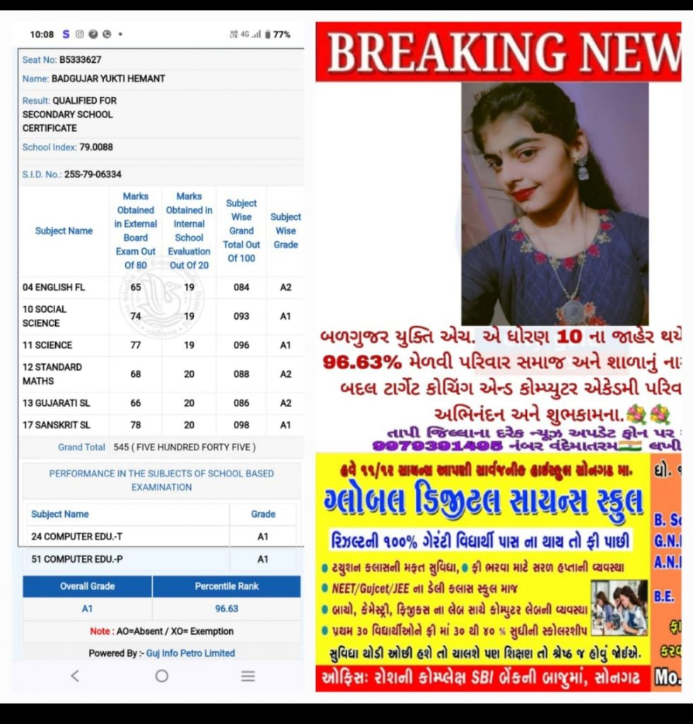 गलवाडे ह. मु. उकई डॅम, गुजरात येथील श्री.लोटन बाबुराव बडगुजर यांची नात उकई डॅम, गुजरात येथील श्री.लोटन बाबुराव बडगुजर यांची नात श्री. हेमंत लोटन बडगुजर व सौ. दिपाली हेमंत बडगुजर यांची कन्या युक्ती हेमंत बडगुजर ह्या १० वी गुजरात बोर्ड परीक्षेत ९६.६३% मार्क मिळवून घवघवीत यश संपादित केले आहे. कु. युक्ती हेमंत बडगुजर हिचे अखिल भारतीय युवक समिती, बडगुजर. इन, प्राऊड ग्रुप, बडगुजर युवा संगठन सुरत, 👣जय चांमुडा माता हिरकणी ग्रुप👣 यांच्या कडून हार्दिक अभिनंदन व भावी वाटचालीस शुभेच्छा!