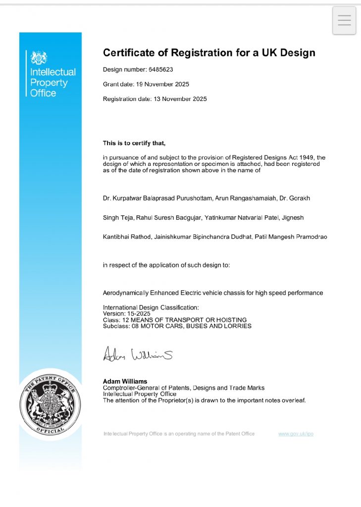 पिंप्री खुर्द ह.मु. धरणगांव येथील निवृत्त पाणीपुरवठा विभागाचे श्री. सुरेश रघुनाथ बडगुजर यांचे द्वितीय चिरंजीव ह. मु. पुणे चाकण येथिल चि राहुल यांचे पेंटेंट Aerodynamically Enhanced Electric vehicle chassis for high speed performance